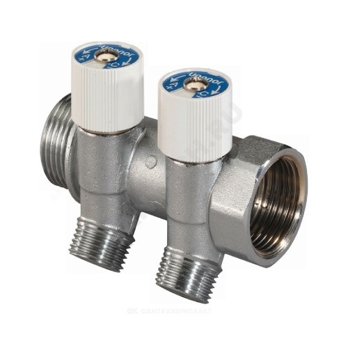 Коллектор латунь 1" ВР/НР на 2 вых 1/2" НР м/о 50мм с запорно-регулирующими клапанами Icma 87227PG06