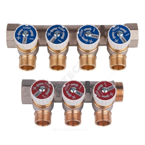 Коллектор латунь 1" ВР/НР на 3 вых 3/4" НР м/о 50мм с запорно-регулирующими клапанами Icma 87229PH06